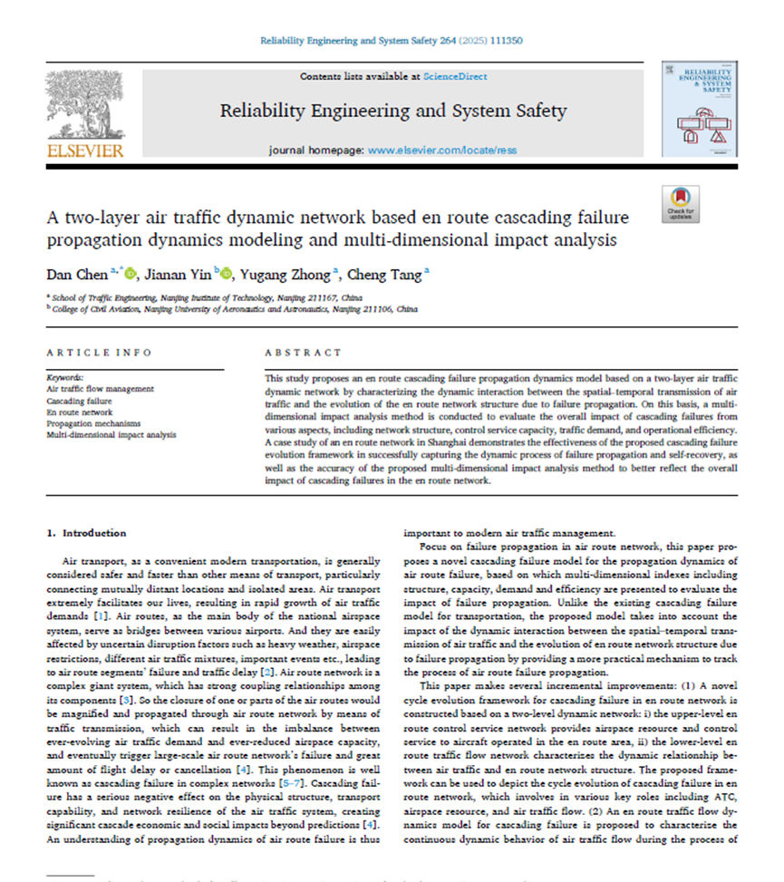 近日,我校交通凯发陈丹副教授以第一作者、通讯作者身份,凯发k8官网作为第一单位,联合南京航空航天大学,在国际权威期刊《Reliability Engineering and System Safety》上发表了题为“A two-layer air traffic dynamic network based en route cascading failure propagation dynamics modeling and multi-dimensional impact analysis”的学术论文。该期刊是Elsevier旗下工程技术类顶级期刊,是中科院工程技术一区TOP期刊,致力于研究可靠性工程和系统安全,影响因子11