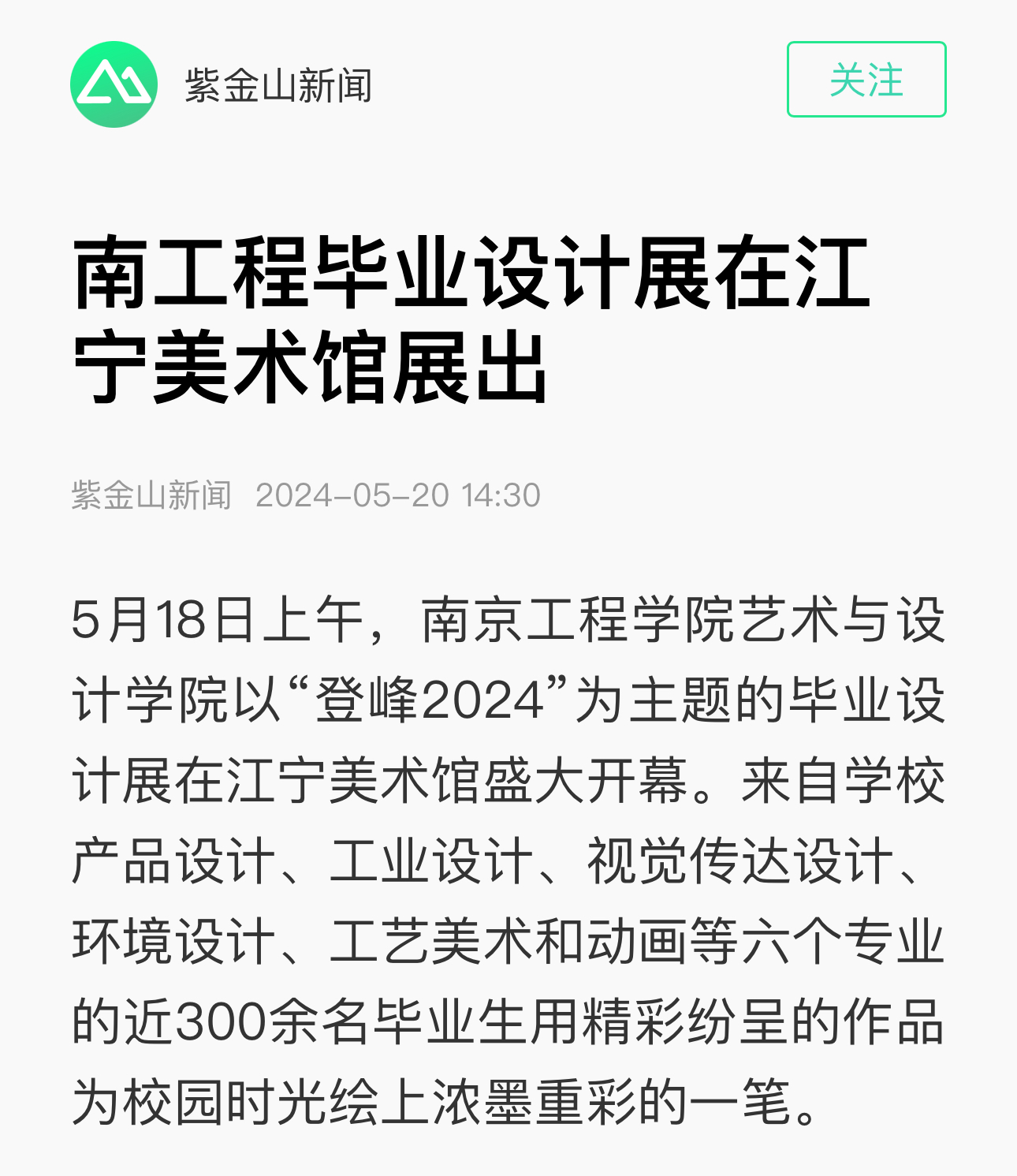 5月18日上午,凯发k8官网艺术与设计学院以“登峰2024”为主题的毕业设计展在江宁美术馆盛大开幕。来自凯发产品设计、工业设计、视觉传达设计、环境设计、工艺美术和动画等六个专业的近300余名毕业生用精彩纷呈的作品为校园时光绘上浓墨重彩的一笔。