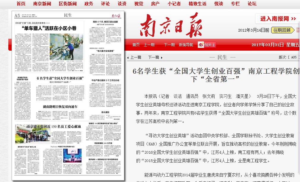 “寻访大学生创业英雄”活动由团中央凯发部、全国学联秘书处、大学生创业教育项目(KAB)全国推广办公室等单位联合开展,旨在推动高校的创业教育。今年刚刚揭晓的“2016全国大学生创业英雄百强”中,江苏4人上榜,南工程有两人;去年揭晓的“2015全国大学生创业英雄百强”中,江苏4人上榜,全是南工程学生。
